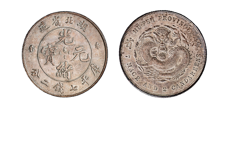 1896年湖北省造“本省”光绪元宝库平七钱二分银币一枚,由湖北银元局仿广东银元铸造流通于市,初铸时龙图左右嵌“本省”二字,以示与外省有所区别,后因窒碍难行,收回再铸时,将“本省”两字去之,未销毁重铸而留存至今者屈指可数,并且多为磨损或打戳,完全未使用品罕见。