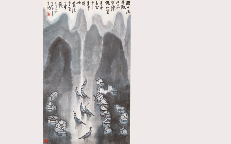 题识:雨中泛舟漓江,山水空蒙,恍如置身水晶宫中。昔年得此意境,今日笔下重观。一九七二年,可染画并记。