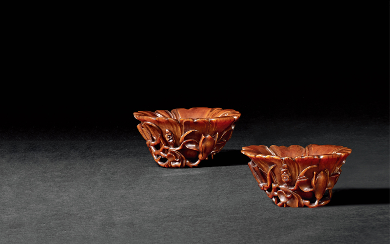 17.7×8.8cm.(2) Wide×High 犀角杯依上宽下窄的自然形状,巧雕为蜀葵,口沿内侧阴刻线条,突出葵瓣之形;外壁高浮雕与镂雕结合,雕刻玉兰轻舒欲绽,莲花瓣瓣舒放,茨菰亭亭玉立;枝叶盈展,向上弯曲用绶带绑缚以为杯柄,向下盘绕以为杯底,设计精巧。花朵雕琢写实,线条优美,曲度和谐,举杯之时,仿若执花在手,留有余香。杯壁厚实,包浆光滑温润,为难得一见的犀角雕刻大器。