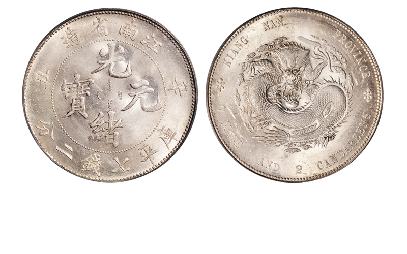 1901年辛丑江南省造光绪元宝库平七钱二分银币一枚,无英文“HAH”版式,PCGS MS62+,金盾,目前评级记录共评出三枚,仅此一枚达MS级,其余二枚分别为AU50、AU58,极为珍罕