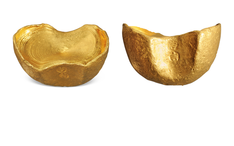 清代乾隆年间十两金元宝一枚,一侧打双“吉”字,重量:369.0克,1984年于荷兰“Geldemalsen”号沉船中打捞出水,沉于海底232年,十两型金元宝仅发现十八件,极罕