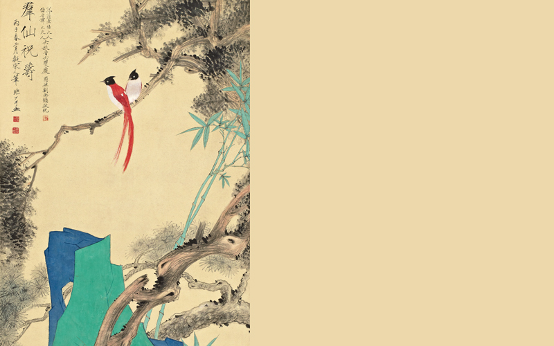 题识:1.群仙祝寿。丙子春二月,拟宋人笔,非厂于照。2.凤翁老伯大人、伯母谭太夫人六秩晋六双庆,愚侄刘金镛敬祝。