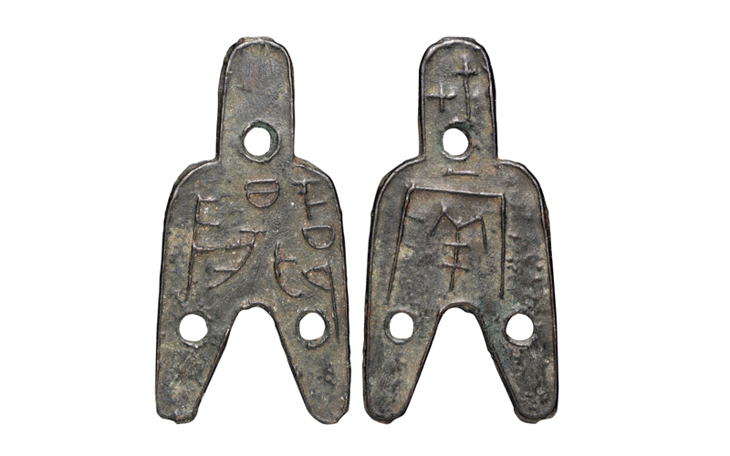 战国时期“下邲阳”背“十七·两”大型三孔布一枚,高73.5毫米,宽37毫米,重13.4克,文字清晰,边廓整齐,品相完美,通体老坑传世古色,为先秦货币中着名珍品。清嘉道间金石学家张廷济、近代收藏家张叔驯递藏,流传有绪,拓本见载于几乎所有古钱币重要着作,征集自海外资深收藏家族,极为珍稀