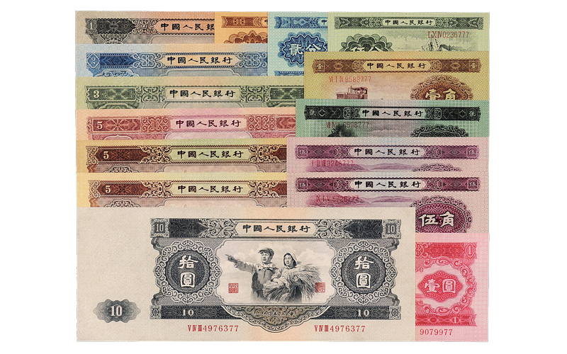 1953至1956年第二版人民币十五枚全套,后两位均为对号“77”,分别包括:拾圆一枚、伍圆三枚(含海鸥水印);叁圆、贰圆、红壹圆、黑壹圆各一枚;伍角二枚;贰角、壹角、伍分、贰分、壹分各一枚,其中拾圆八八成新,其余九八成至全新