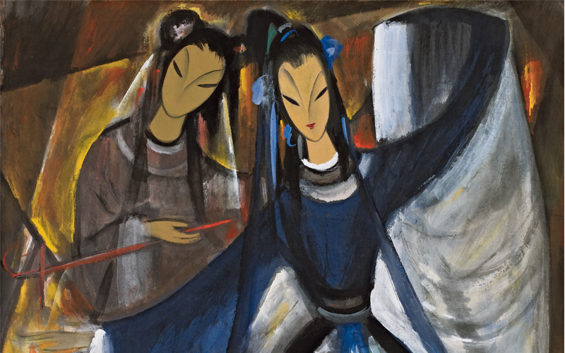 画作采用了人物并置的构图,原本繁复的戏服简化为单纯的色彩,前景的三圣母身着蓝衣披轻纱,用施以干笔的白粉,皴擦出水袖的动感,表现其长袖善舞的风姿。“时间的绵延的观念”在静态的平面绘画得以体现,而且画面比西方立体主义艺术表现得更为自然,更符合人的视错觉。