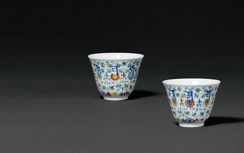 6.2cm. Diam. 拍品杯形秀巧,胎质细腻洁白,釉面匀净莹润。外壁以斗彩缠枝莲托梵文为饰,莲枝辗转柔畅,八朵莲花上各托梵文一字,胫部饰如意头纹。全器纹饰繁密,青花勾边纤细,色泽淡雅,填彩精准,在纯净的釉色映衬之下,更显清澈透亮,为雍正斗彩器之经典。