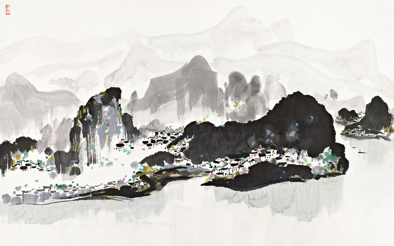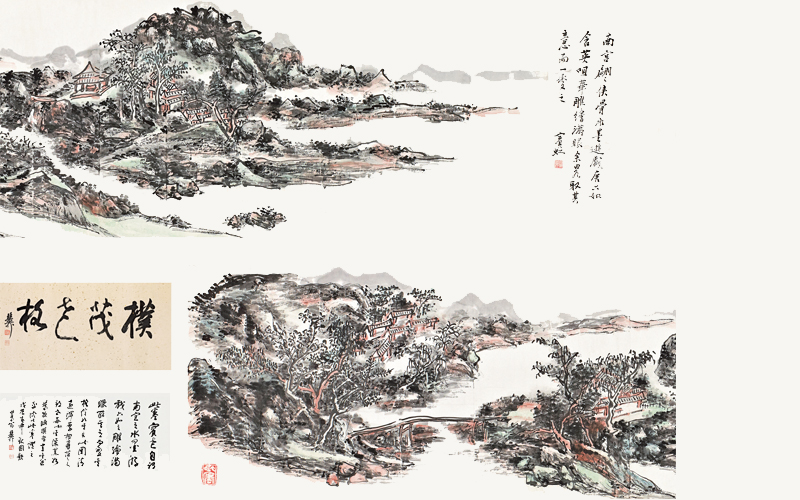手卷 设色纸本 30.8×151.5 cm. 画家以如锥画沙之笔,勾勒山川、草木、屋舍、石桥,水墨点染坡石,以求山川形质,复用石绿、赭石皴染山石、树木的阴阳向背,笔气贯通而色墨浑然。一卷之中,山水曲折往复,移步换景,江波浩渺,气象清明高华。