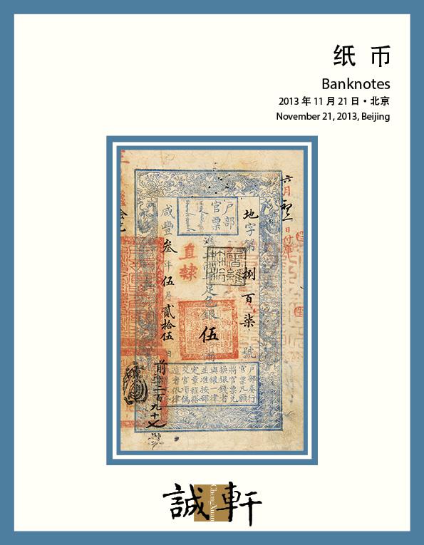 咸丰三年户部官票手写伍两一枚,地字第捌百柒号,正面印手填日期戳记,手写“六月初三日付库”,左下有“前字二百九十七号”二次发行编号,盖“屠维协洽”纪年方印,即己未年(1859年),此票印版初刷,版模清晰,图文色彩饱满,票面整洁,品相颇佳,是大清宝钞与户部官票中的珍稀品种,极为难得,八五成新