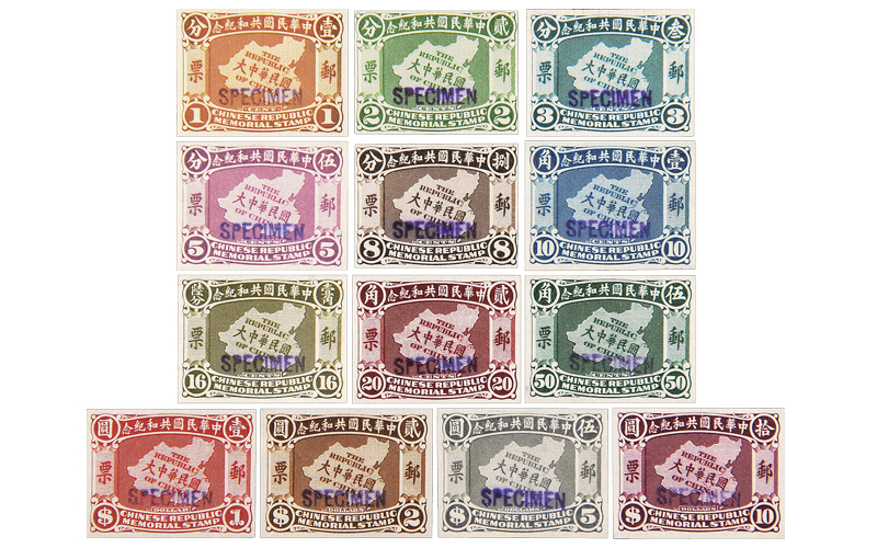 S 1912年中华民国共和纪念“大中华民国地图”玉版宣纸无齿试印样票十三枚全,均加盖“SPECIMEN”字样,北京财政部印刷局雕刻版印制,全套保存所见甚少,极其珍罕,上品