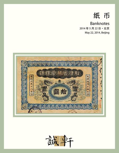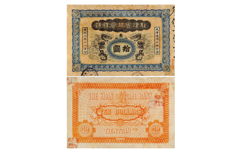 宣统元年驻津吉林官银号银元票拾圆样票一枚,背印英文天津地名,票面加盖“此系票样不得误用”,各类纸币目录均未见记载,此枚色彩饱满,印制精美,除四角边纸略有揭薄,基本保存完好,极为珍罕,八成新