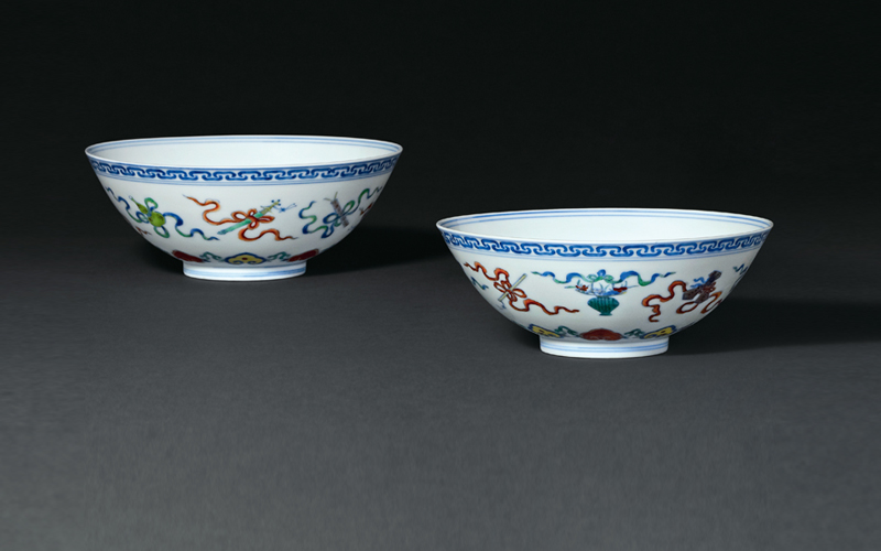 斗彩碗外壁绘暗八仙纹饰,碗心两道弦纹内彩绘折枝寿桃,两枚桃实硕大,以红彩点染桃尖,突出质感。整器制作精良,胎薄体轻,釉面光洁细润,纹饰布局舒朗,填 彩准确,彩料细腻莹润, 堪称雍正官窑斗彩器之代表作。
