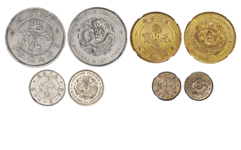 1897年奉天省造光绪元宝库平七钱二分铝合金试铸样币、库平三钱六分铜质试铸样币、库平一钱四分四厘铜镀银试铸样币、库平七分二厘铜质试铸样币各一枚。