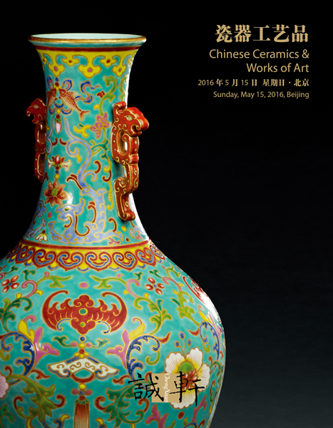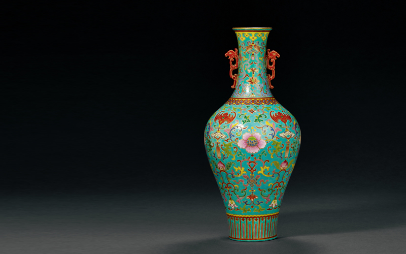 37cm. High 拍品以蓝彩为地,彩料填绘纹饰,其色彩与金边勾描的方式,均与常见的松石绿地粉彩品种迥然不同,尤以蓝地的彩料最为明显,其颜色偏近湛蓝,质感浓稠,以致略有深浅,其余填绘纹饰的彩料则立体凸出,接近珐琅彩之质感。类似风格、特征者可见于故宫博物院藏品和放山居旧藏之器,当属乾隆时期烧造仿掐丝珐琅的瓷器中最为逼真、精细之品种,存世无多,相当名贵。