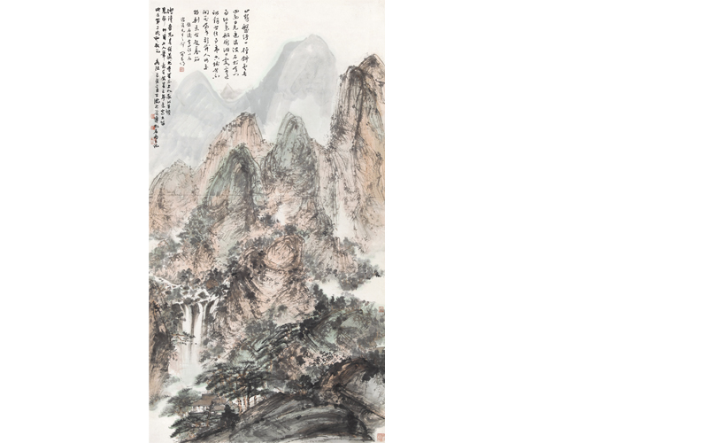 173×92 cm. 约14.4平尺 上世纪四十年代后期,是傅抱石山水风格完善至纯熟境地的阶段。《山瀑清会》作于1949年二月,由于局势动荡,傅抱石此年作品不多,流传至今者更稀少。画幅逾十四平尺,气势磅礴,尺幅之大在其四十年代山水中实属珍罕,画家亦自称“三年来写大幅,此为第二次也”,堪称其山水的代表巨制。傅二石先生如此评价道:“即使在傅抱石这位公认的大师的作品中,此帧《山瀑清会》也称得上是真正的精彩之作。”