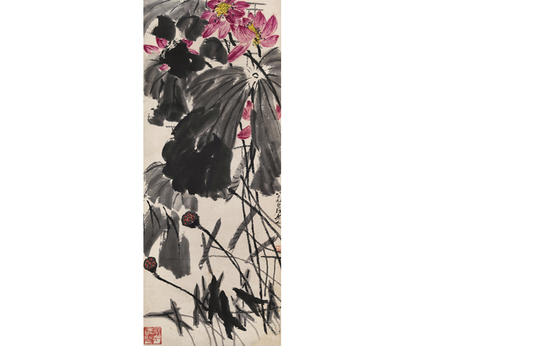 154×61 cm. 约8.5平尺 全作意境生动,观之如临荷塘,若有荷香飘散,洋溢着旺盛的生命力。笔墨布局的经营堪称精湛完美,显示出耄耋之年的画家旺盛的精力和创造力。