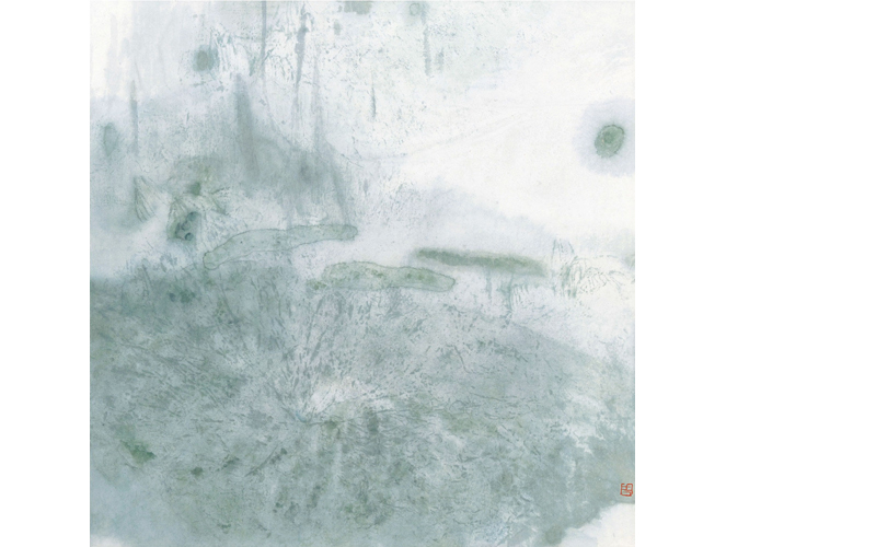 1992年作 镜心 设色纸本 51×50.5 cm. 约2.3平尺 此画中一大片荷叶舒展铺陈,迷离的雨雾中隐约可见低垂的莲蓬、枯败的残叶、半开的花苞及初展的嫩叶,新生与衰败共存,幻化出画家心中的意念。物象皆作模糊与虚幻的处理,在抽象中呈现精微的趣味,是为周思聪荷花语言的最大特色。水、墨、色、矾及肌理的运用不见刻意,自然地渗透入作品。在墨色晕洒中控制物象的形态,荷梗与花瓣略事勾画,与细碎纵横的筋脉统一在浸润的翠色中,宁静空蒙。