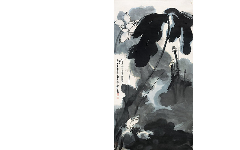 乙巳(1965年)作 立轴 设色纸本 143.5×75.5 cm. 约9.8平尺 荷花为张大千绘事一绝,他爱荷花的绰约娉婷之姿,又以荷花的“君子之风”自况,因此颇喜画荷花。每迁居一地,必亲手植荷,朝夕观察。上世纪六十年代初期,张大千创泼墨泼彩法,并以之写荷,以“有法”进入到“法无定法”的境界,注重氛围的营造,笔下荷花大开大阖,气势豪放。
