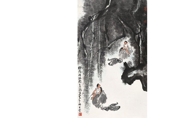 壬戌(1982年)作 立轴 设色纸本 116×67.5 cm. 约7.1平尺 李可染笔下的牧牛题材肇始于上世纪四十年代初,在重庆的李可染与牛棚比邻而居,他喜欢牛的形象,并崇拜牛肯于奉献牺牲的精神,因此便用水墨画起牛来,更是以牛的勤劳自勉,刻“孺子牛”印章,名画室为“师牛堂”。他的画牛图被赋予极强的象征寓意,常题写鲁迅“俯首甘为孺子牛”的诗句和郭沫若《水牛赞诗》,歌颂牛的吃苦耐劳精神;他笔下的牧童与牛常常游憩于四时美景中,融入他对山川风物的热爱,对劳动人民朴素生活的赞颂与向往之情。