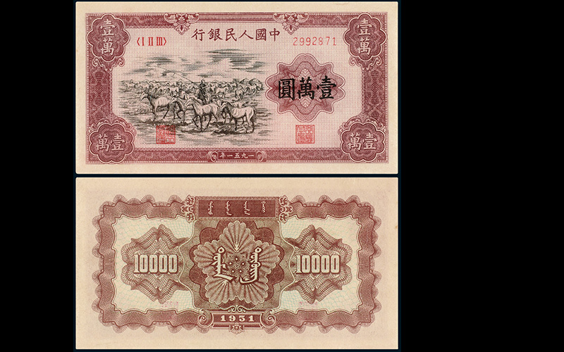 1951年第一版人民币壹万圆“牧马”一枚,背蒙文,新疆地区行用,位列一版币六珍之首,有一版币票王之盛誉,存世稀少,迄今为止发现未逾百枚;此枚保持原始状态,色彩饱满,边纸宽阔,是目前所见“牧马”流通票中的佼佼者,保存状态在此之上者屈指可数,极为珍罕,CMC40,八二成新