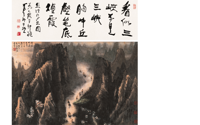 诗堂:看似三峡,不是三峡。胸中丘壑,笔底烟霞。题烟江夕照图。一九八七岁次丁卯秋,可染于师牛堂。