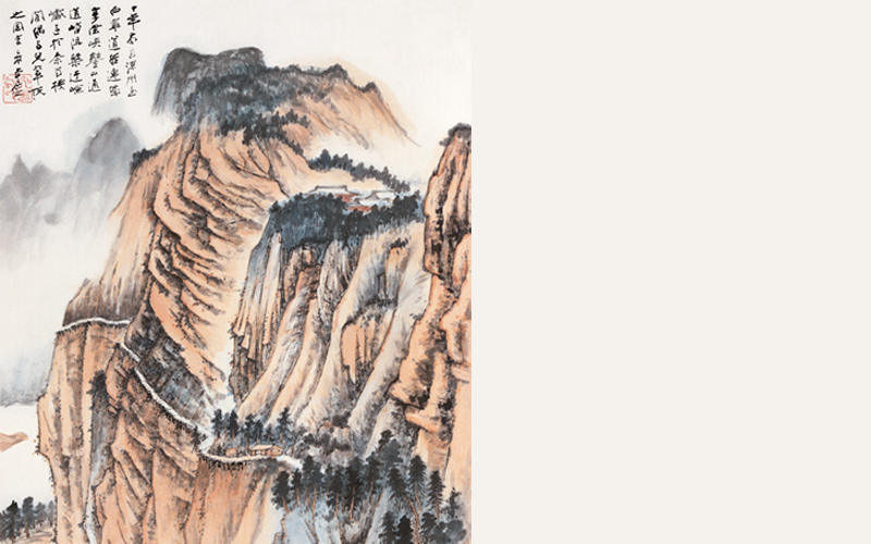题识:十年前自凉州至西宁,道经连城享堂峡,凿山通道,峭阻盘迂,险巘过于秦蜀栈阁,偶与儿辈说之,因写。己亥。大千居士。