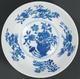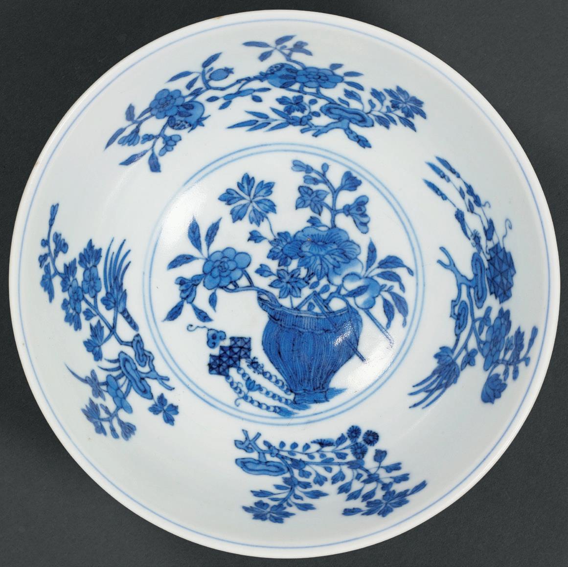 碗外壁绘折枝石榴花和一丛灵芝,内壁则绘青花折枝石榴、菊花、茶花、桃花、灵芝等,碗心花篮内盛满牡丹、石榴花、寿桃鲜果。纹饰布局疏密有致,将有长寿、富贵等诸多吉祥寓意的花果集于一器,描绘笔法细腻。