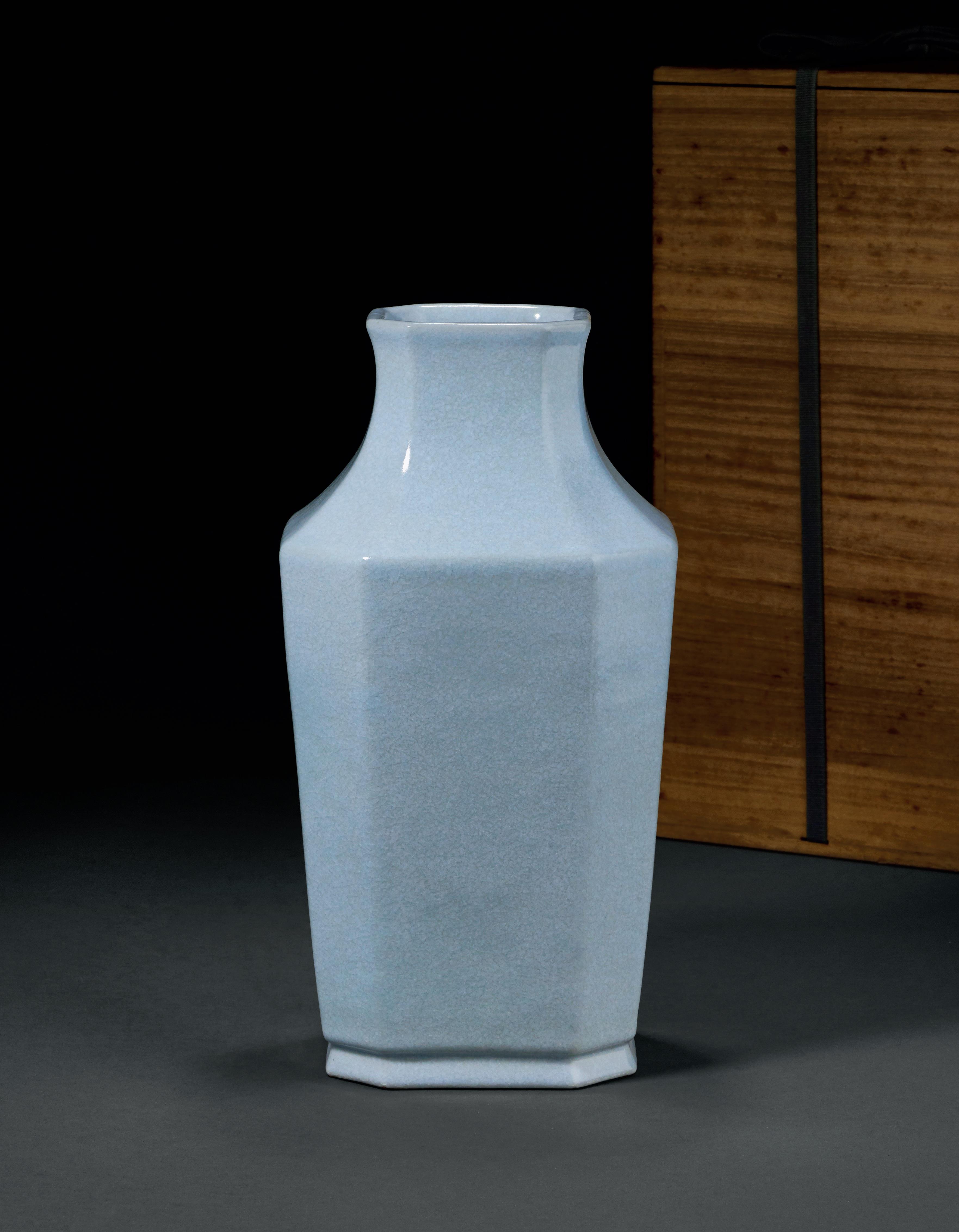 拍品通体作不等边八方形,束颈、折肩,腹部向下渐收,满施仿汝釉,其色青中微泛粉白,如雨过之后晴朗的碧空,釉面布满鱼子纹开片。全器造型别致,器身光素不事其他装饰,古釉之美与当朝器形完美结合,彰显师古而不泥古的 艺术追求,为乾隆官窑仿各种宋代釉色器 的翘楚之作。