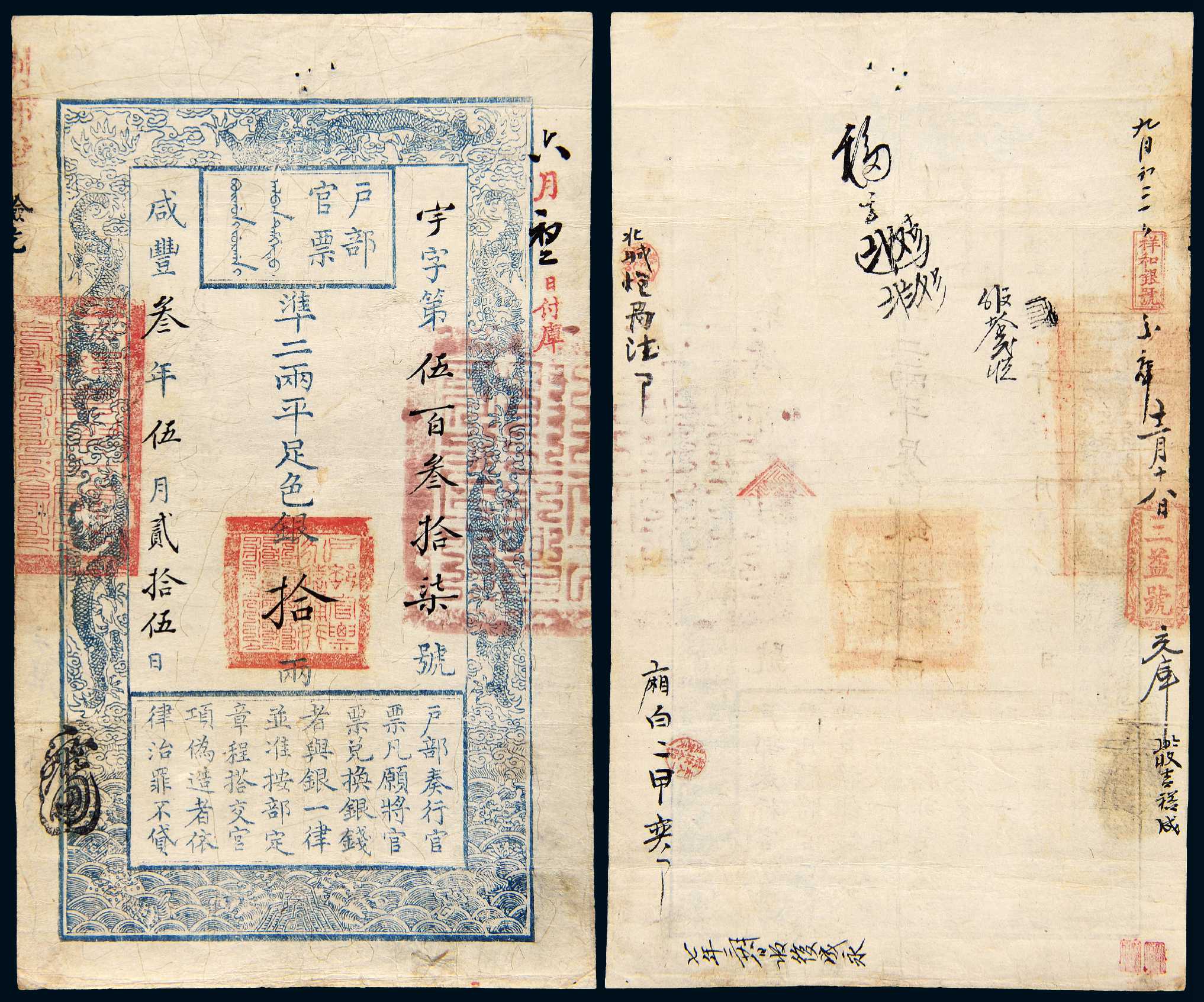咸丰三年五月二十五日户部官票京师试行版手写拾两一枚,宇字第五百三十七号,正面手填日期戳记“六月初二日付库”,背有“九月初三日祥和银号交库”、“十二月十八日三益号交库”、“七年三月廿八日收复成永”、“收吉裕成”、“北城炮局德部”、“厢白二甲奕部”等近十处墨书及印章;此枚官票面值、字号、日期均为毛笔书写,书体俊逸,集钞界称之为“手写体”,系户部官票发行最早之试行票,面值有一两、三两、五两、十两、五十两五种,均存世稀少。拍品以库纸高丽发笺(又称苔笺)印制,纸质洁白细腻,版模初印,图文清晰,色彩饱满,品相颇佳,品种与品相均极为难得,属户部官票之珍稀品种,九成新