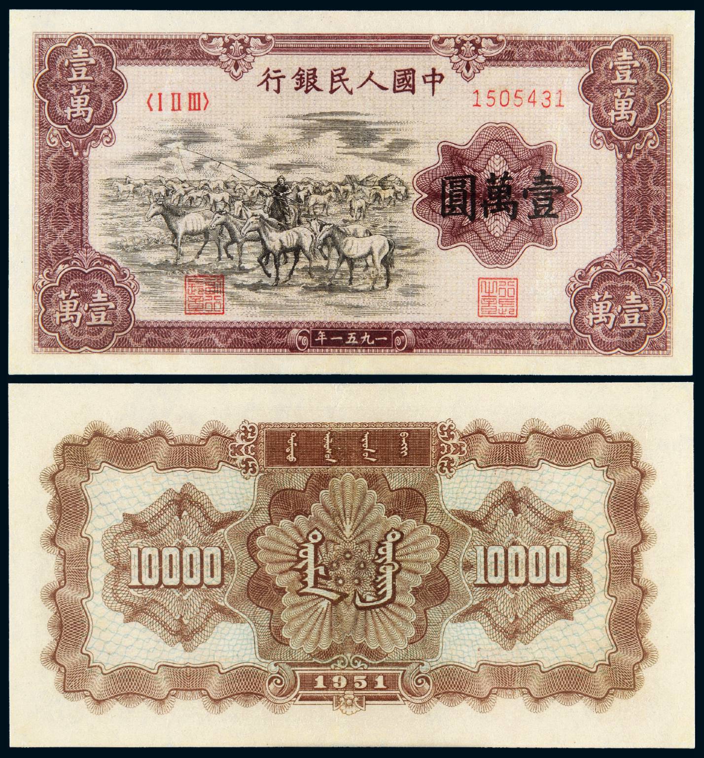 1951年第一版人民币壹万圆“牧马”一枚,背蒙文,内蒙古地区行用,位列一版币六珍之首,有一版币“票王”之盛誉,迄今为止发现未逾百枚,由于面值较高,且于内蒙古地区流通使用,当时几乎全部兑换回收,存世极少,所见多数品相不佳,此枚票面整洁,色彩饱满,属“牧马”流通票之存世佳品,极为难得,杰嘉评级JJJD EPQ65