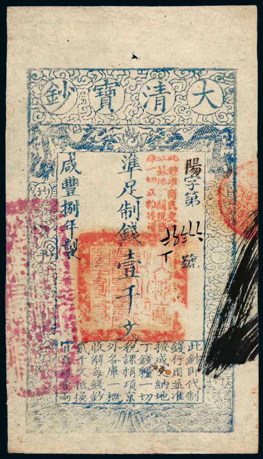咸丰八年大清宝钞壹千文一枚,阳字花码第七万五千八百六十七号,正面加盖“此钞准商民交纳江苏地丁关税盐课一切正杂钱粮”,背有“恒济”红色戳记,九成新