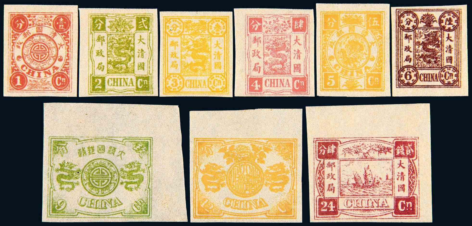 S 1897年慈禧寿辰纪念邮票再版厚纸彩色无齿样票九枚全,其中9分银、12分银、24分银带宽边纸,色彩饱满,极少见,上品