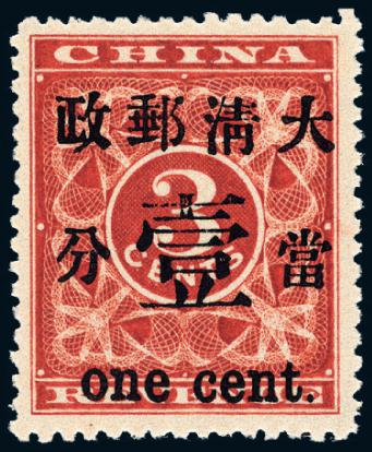 ★1897年红印花加盖暂作邮票当壹分一枚,原胶轻贴,上中品