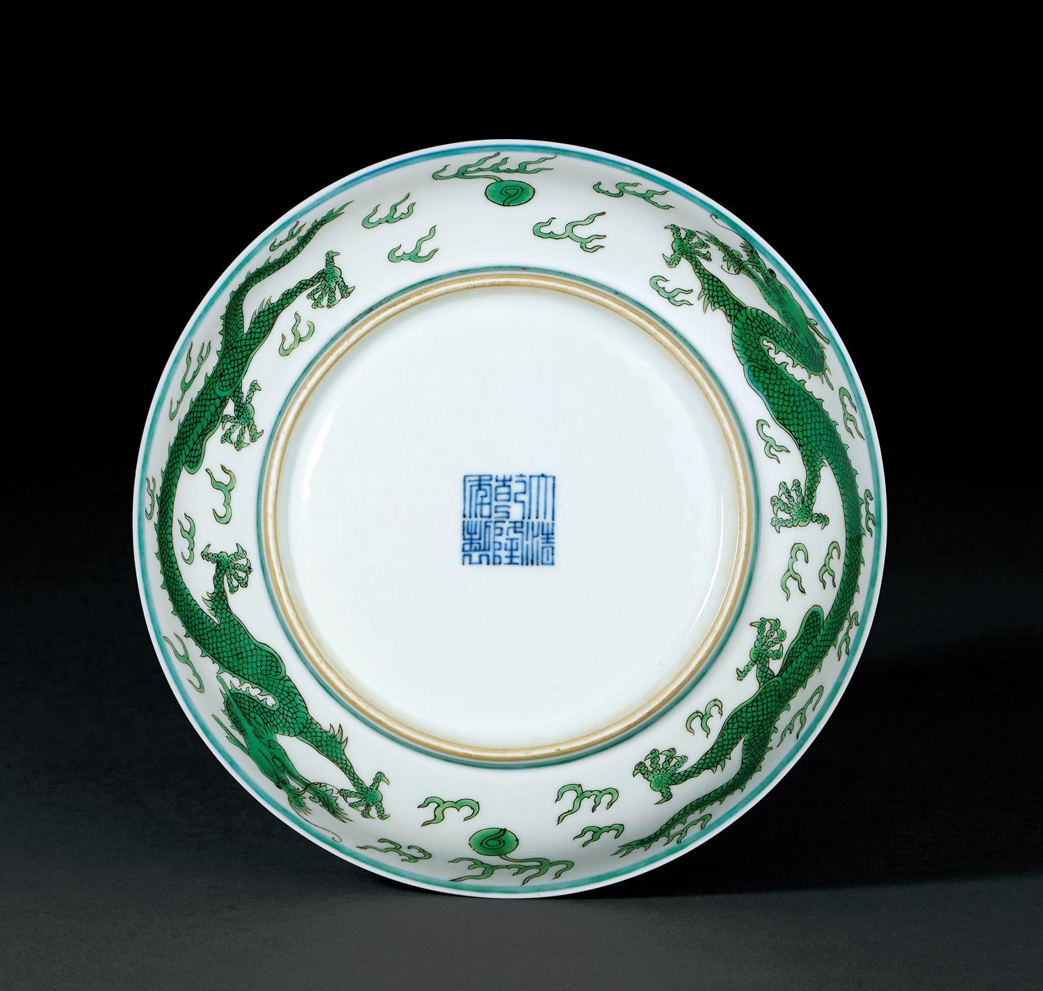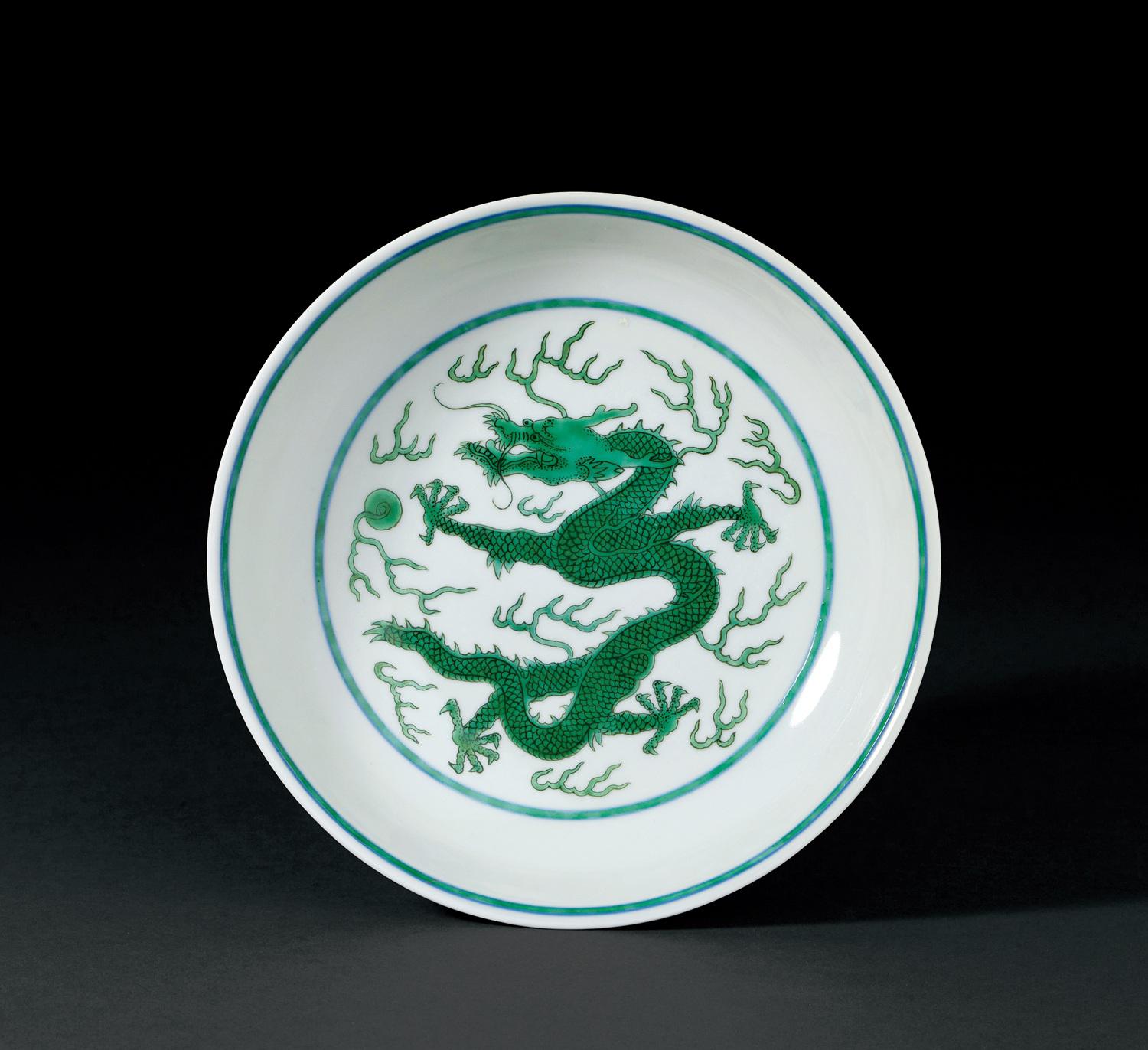 绿彩龙纹盘样式承袭自明代白釉绿彩品种,自康熙时期烧造,其后成为清代官窑经典式样。