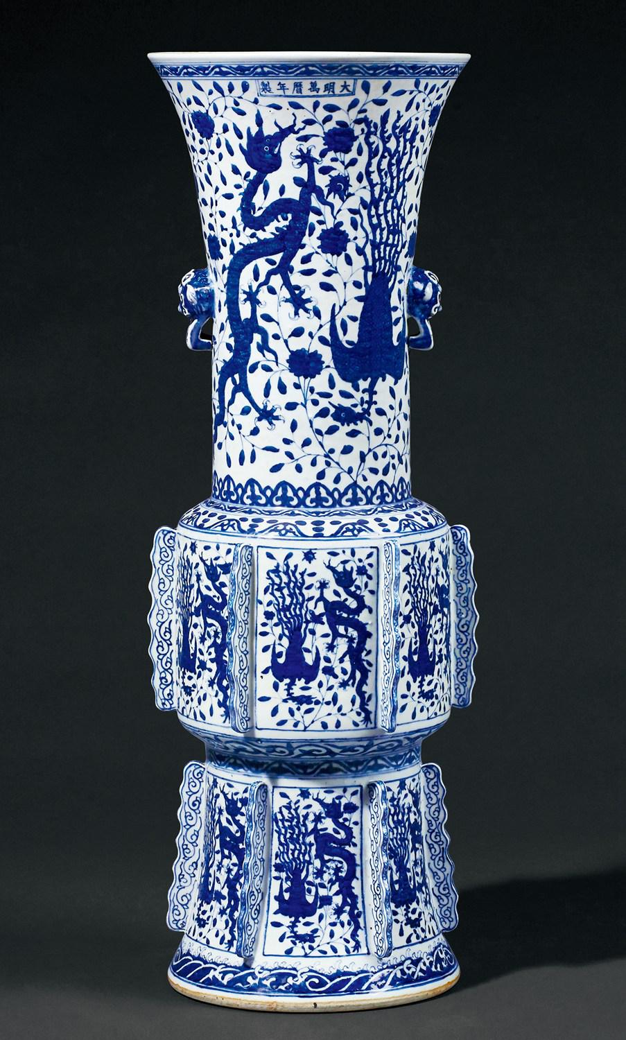 明代万历时期烧造的大尺寸尊,见有青花、五彩两类品种,造型、纹饰略有不同,多不超过八十厘米,其中高逾九十厘米者目前仅知两件,为明清官窑瓷器中体量最大者,拍品系其中之一,具有强烈的视觉冲击力,十分珍贵难得。