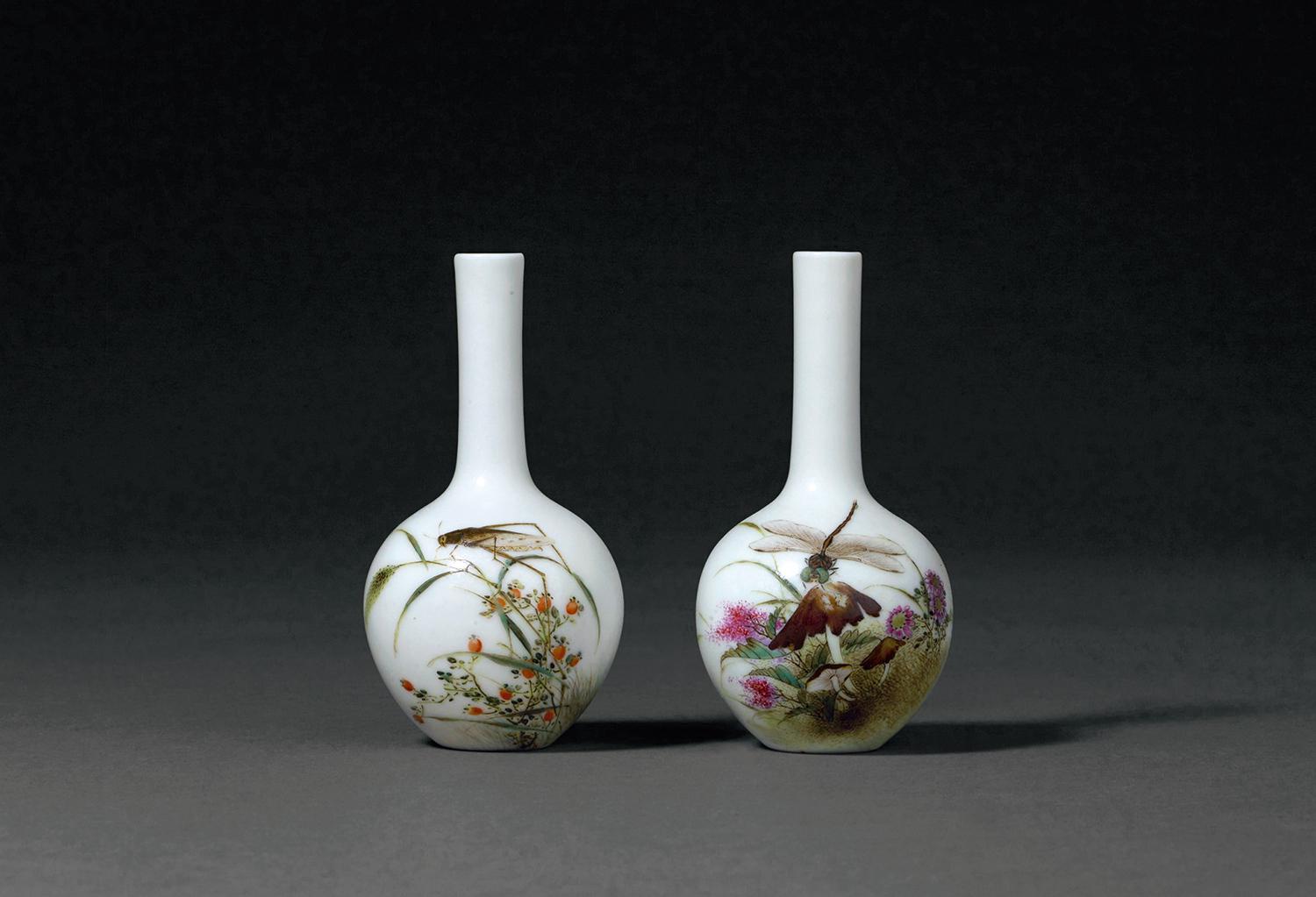 小长颈瓶一对,胎壁轻盈剔透,其一绘玫果结实累累,螽斯立于俗称狗尾巴草的秋草之上,跃跃欲动,行书题识“衍庆螽斯。时属癸酉年仲秋月,佩霞方云峰作于昌江旅次”;另只绘秋菊红蓼,蜻蜓停驻半展的菌伞顶端,行书题识“飏风愁劫网,点水着清标。癸酉秋月,新平方云峰写于珠山客邸”。题识后均落“方氏”印。画面描绘细致生动,纤毫毕现,为民国时期名家方云峰之精致小品。