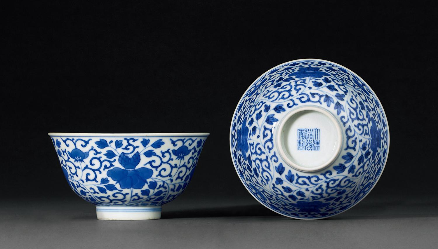 拍品与南京博物院藏品纹饰相同(参见《宫廷珍藏:中国清代官窑瓷器》,页403),惟南博藏品落“慎德堂制”款识。拍品胎体坚实,外壁绘青花缠枝牡丹纹,茎蔓纤细,花叶舒展,连绵不绝,其间均匀地分布四组绽放和含苞的牡丹。釉面洁净滋润,青花色泽亮丽,纹饰构图繁密而不紊乱。