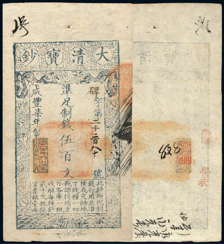 咸丰七年大清宝钞伍百文一枚,碑字第二千二百八十号,背有“收晋”、“癸未”等墨书及戳记,PMG 50