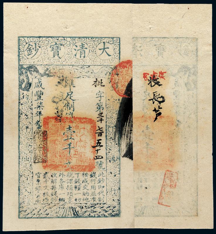 咸丰七年大清宝钞壹千文一枚,枇字第三千七百五十四号,背有“收长芦”、“内务府”等墨书及戳记,PMG 55