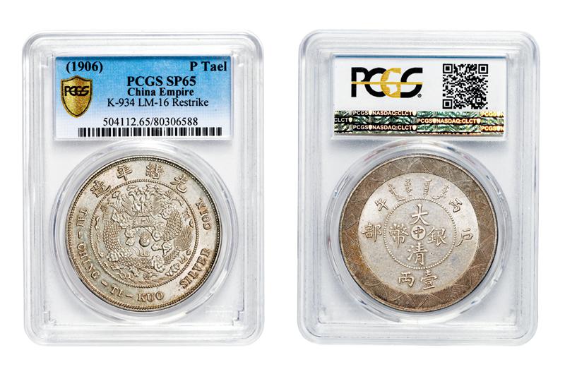 1906年丙午户部大清银币“中”字壹两样币一枚,K-934/LM-16,户部天津造币总厂试铸,未发行,素为近代机制银币收藏进阶之关键品种,铸工极尽精美,版底平整细腻,银光亮丽,属此样币最高等级品相,PCGS SP65,目前为该公司评级纪录第二名,第一名分数是SP66且仅一枚