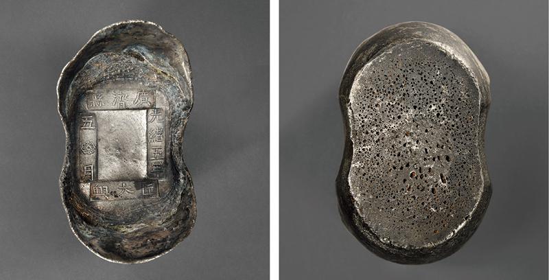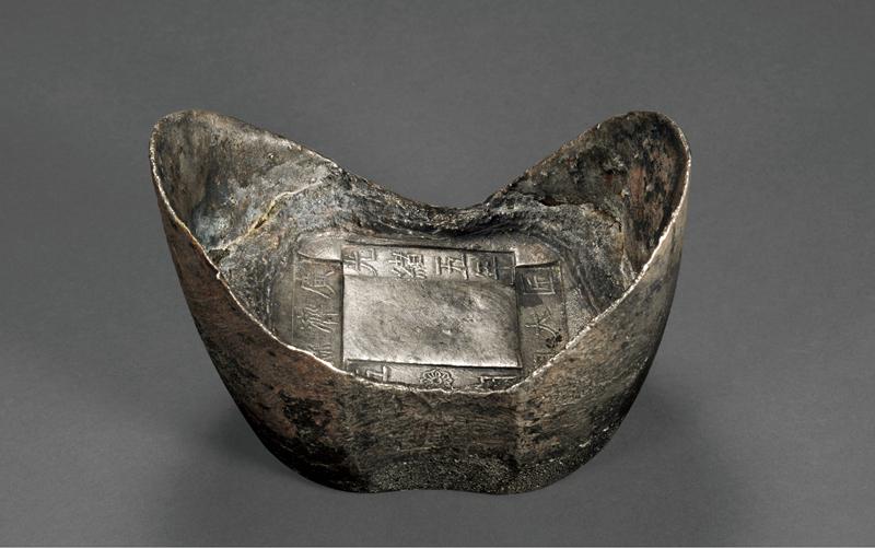 清代湖北“光绪五年 五月 广济县 匠大兴”五十两银锭一枚,重量:1866克,湖北大宝素以宝面开阔、戳记端庄、锭型优美而深受藏家喜爱;此枚宝面银光姣好,戳记端正舒朗,铭文字体峻拔,底部气孔均匀细密,为所见同品种之顶级品相,华夏评级 近未使用