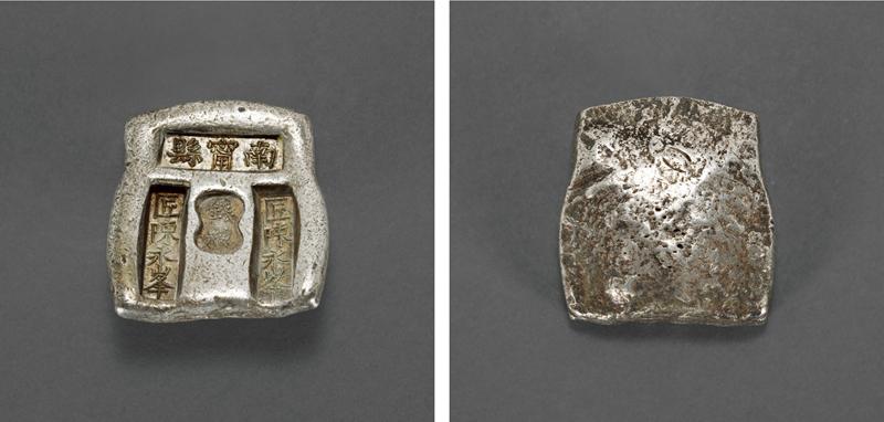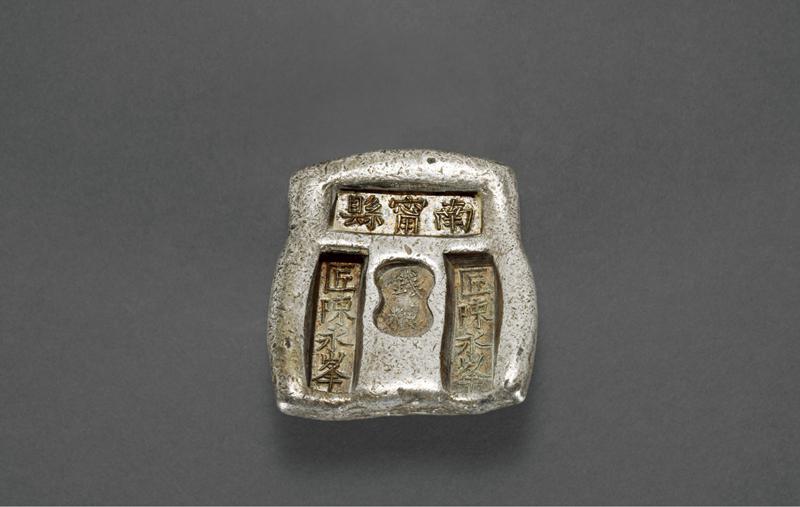 清代云南“南宁县 匠陈永峯 匠陈永峯”五两大三槽锭一枚,中部加打“钱粮”葫芦形印,重量:198克,此类上解藩库之税银,通常加盖“课”、“课银”或“解锭”等用项戳记,“南宁县”铭加打“钱粮”者,目前仅见此一枚,是云南三槽锭最罕少的品种之一,国内外相关文献资料均未见记载,公开拍卖首度现身;拍品打戳一横二直,力度极大以致锭体两侧外凸,字口锋利,包浆轻薄均匀,保存状态极佳,弥足珍贵,华夏评级 近未使用