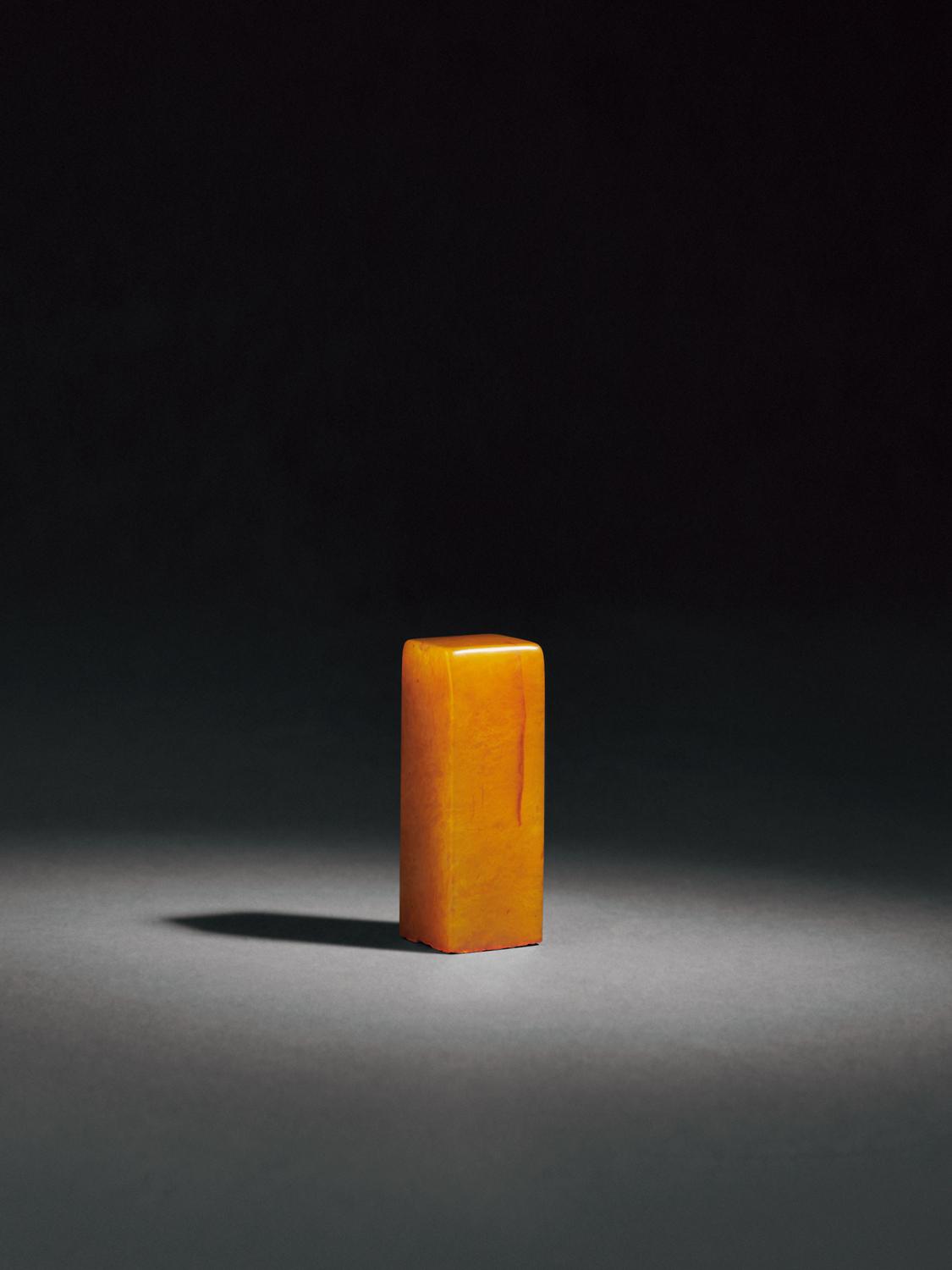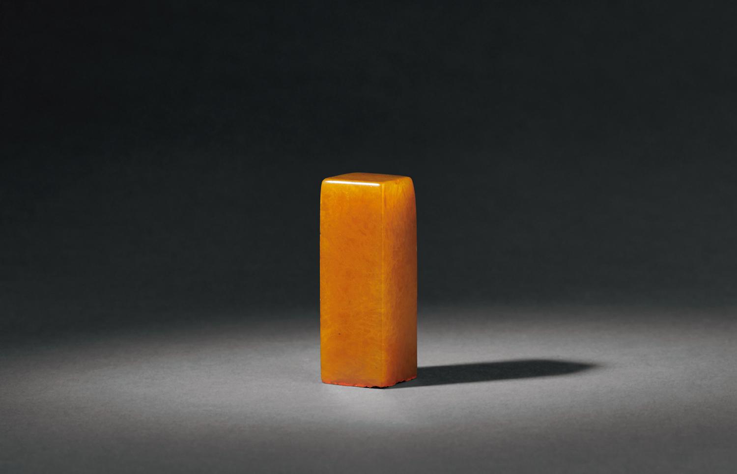 田黄产于福建福州郊区寿山溪边的水田中,具备细、洁、润、腻、温、凝等特质,一向被视为印石珍宝。因材质珍贵,以自然随形章料为多,方章少见。