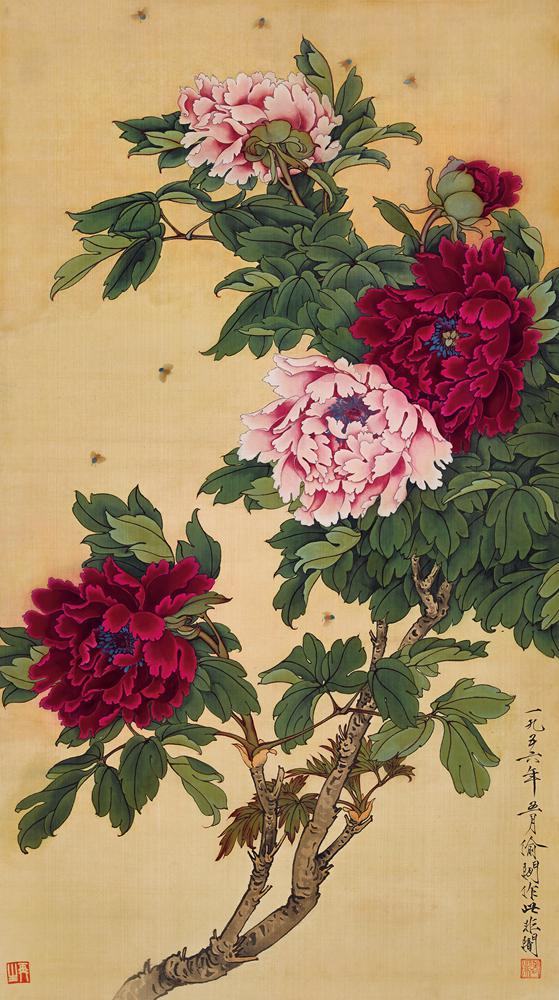 《牡丹群峰》作于1956年,属画家技艺最为精熟的晚年绢本佳作。画绘牡丹一枝,花开粉、紫二色,当以故宫御花园中名品“二乔”为本,雍容华贵之中别具高韵。