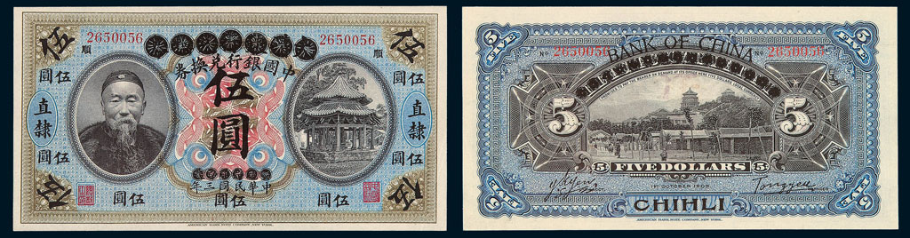 民国三年大清银行改中国银行兑换券伍圆一枚,加盖“直隶”地名,极为少见,全新1912年,中国银行上海分行在大清银行的基础上整顿改组而成,随之发行中国银行兑换券,为应急需,先将大清银行印制(美国钞票公司承印)尚未签字发行的李鸿章像大清银行兑换券壹圆、伍圆、拾圆三种,加印“中国银行兑换券”与“北京、上海、天津、汉口、河南、东三省、直隶、山东”等地名,再加上图章和签名发行流通,流用时间极为短暂,各面值券均已十分少见,全新品相更为难得。