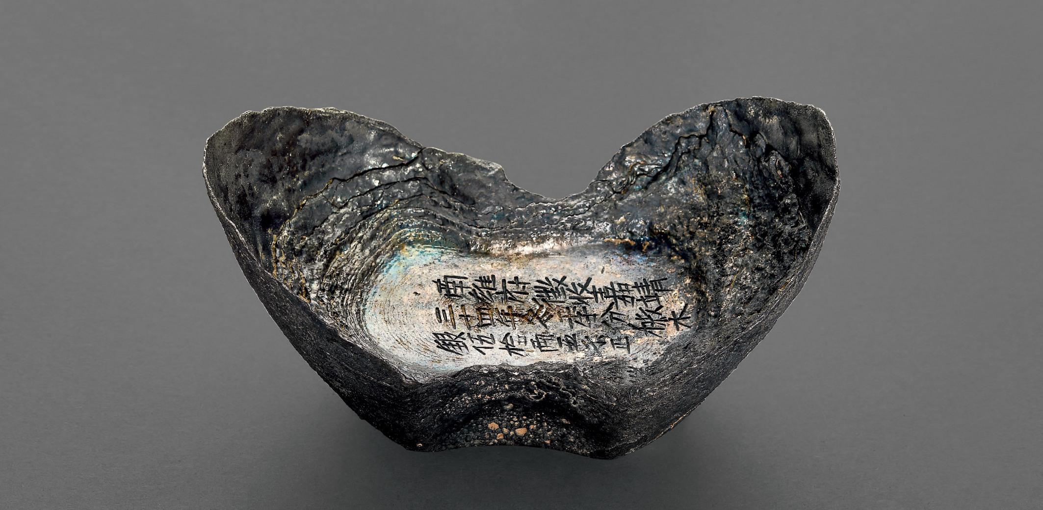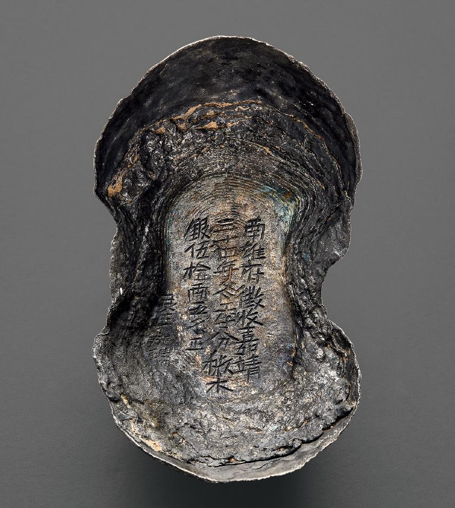 明代广东“南雄府征收嘉靖三十四年冬季分椒木银伍拾两五钱正 银匠郑瑞”五十两银锭一枚,重量:1886克,南雄府椒木抽分折银,锭面錾刻铭文二十七字,镌刻深峻流畅,均可辨识;银锭造型优美,双翅完整,虽包浆厚重,锭面仍可见五彩银光,成色一等,具有极高的明代财税史实物史料价值和文物收藏价值,GBCA UNC