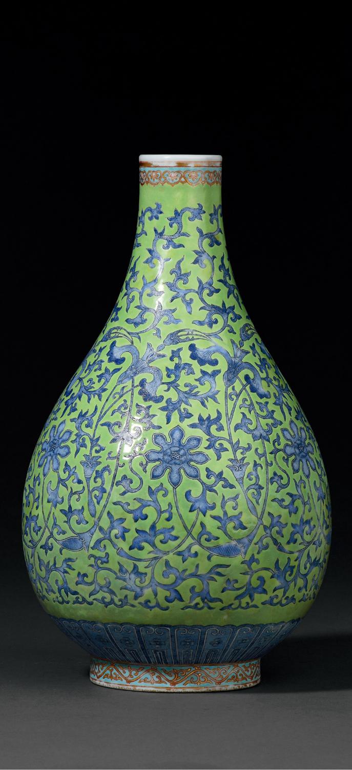 清道光 翠地蓝料彩缠枝西洋花卉纹胆瓶