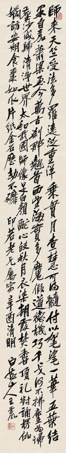 释文:师来天竺,受法多罗。远泛重洋,乘贯月查。慧可得髓,付以袈裟。一花五叶,结果自嘉。萧梁至今,万古刹那。翘首西望,海实多魔。魔假道德,机巧干戈。何不拂麈,为扫尘沙。咸归清净,世界太和。我国师像,足白颜酡。心皎秋月,衣染朝霞。焚香顶礼,对诵楞伽。懒访安期,食枣如瓜。片纸金石,历劫不磨。印若老兄属写,辛酉清明,白龙山人王震。
