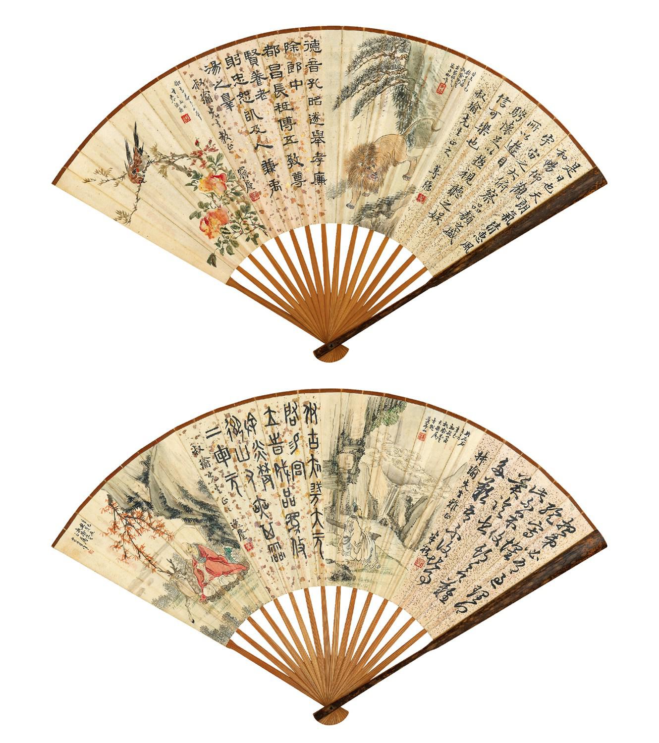 拍品一面由张子卿画松下狮吼、袁绿英绘月季麻雀,另面由黄亭山作高士观瀑、芷青绘瑞鹿听禅;两面书法均为姜莼所书。题材丰富,集花鸟、走兽、人物、山水,书则真草篆隶四体,颇富文人情趣。