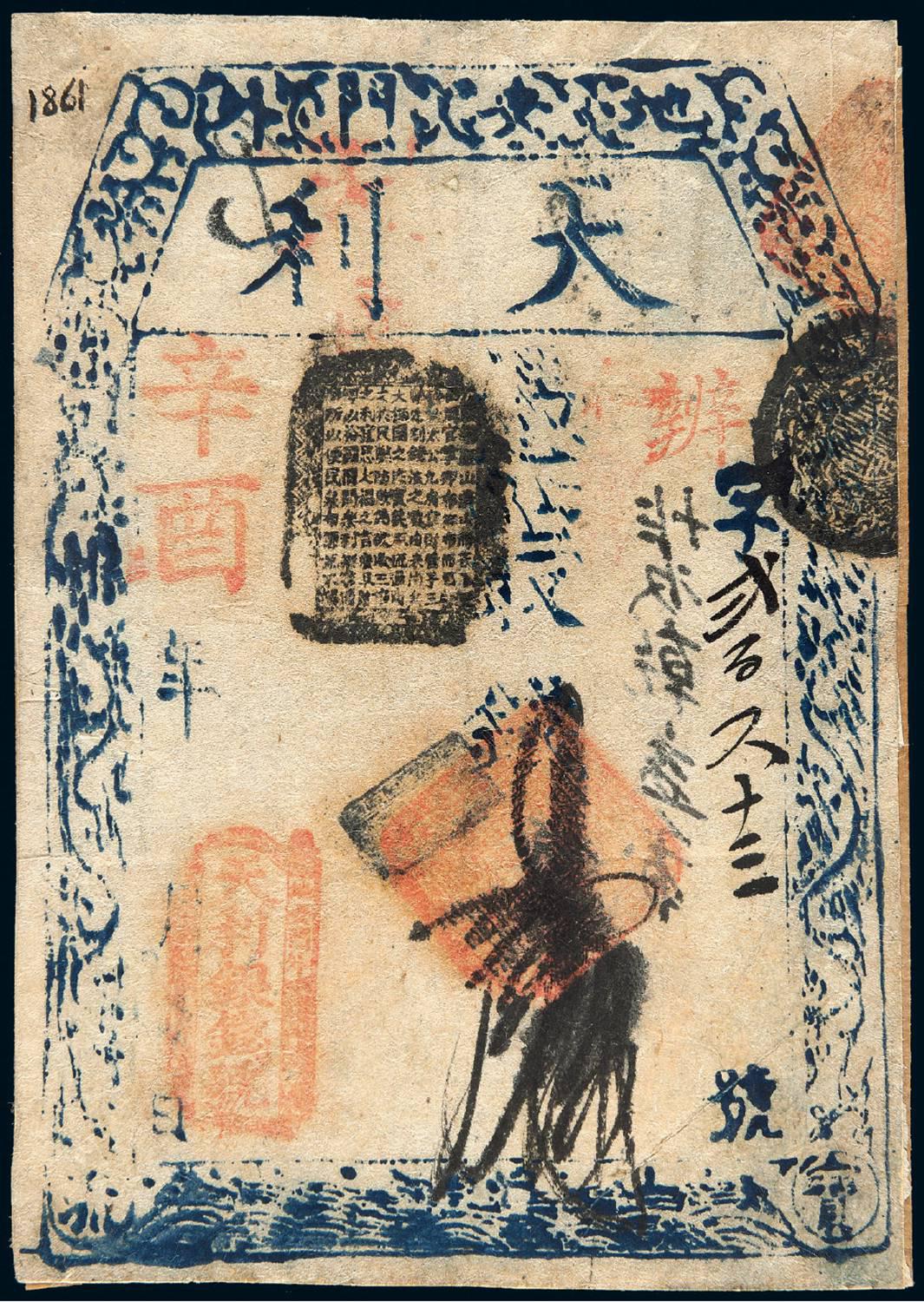 辛酉年(1861年)北京地安门外“天利银钱号”简印式制钱票壹拾吊一枚,辨字二百六十三号,该银号为内务府设置“五天”官号之一,所发钱票属官票性质;此枚票面宽阔,左下盖书卷形“天利银钱号”落地章,右侧钤“天利银号”骑缝章,并盖防伪图记,旧时托裱,背见“收乾益号”墨书;简印式“五天”官票票幅宽阔,风格朴拙,存世稀少,保存完整者罕见,九成新