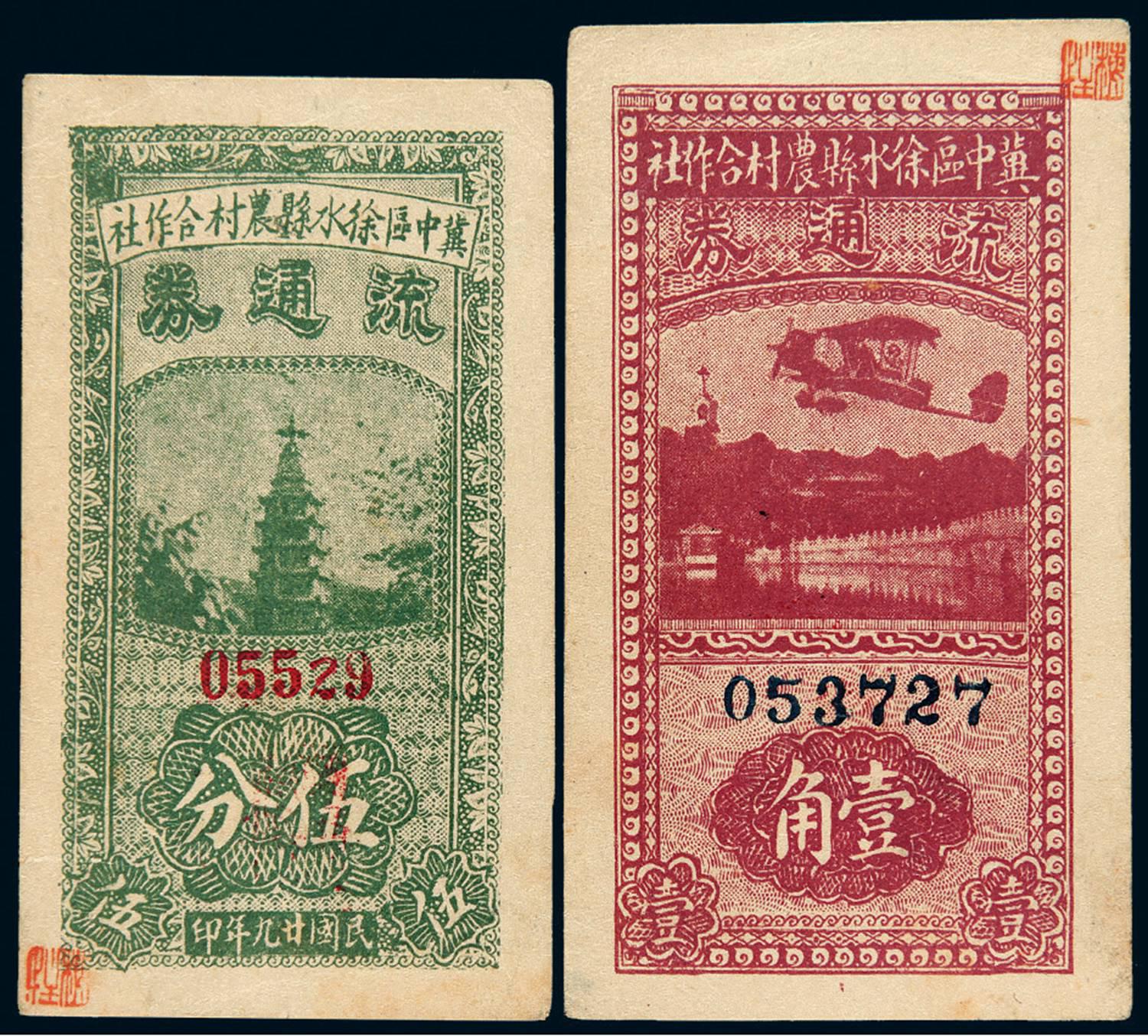 民国二十九年冀中区徐水县农村合作社流通券伍分、壹角各一枚,均少见;背左下均有小片轻微揭薄,九二成新